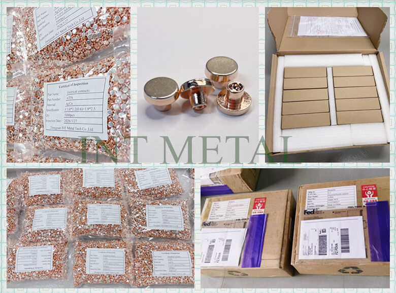 DONGGUAN INT METAL TECH CO LTDwendet das Kaltpressverfahren (Kaltstauchen) an, bei dem Silber oder Silberlegierungen mit Kupfer im festen Zustand durch enormen Druck verbunden werden. Dieses Verfahren gewährleistet eine gleichmäßige Dicke der Silberschicht und eine extrem hohe Bindungsfestigkeit Silberkontakteproduziert vonINT METALLkann die lebenslange Zuverlässigkeit der Kundenprodukte garantieren.